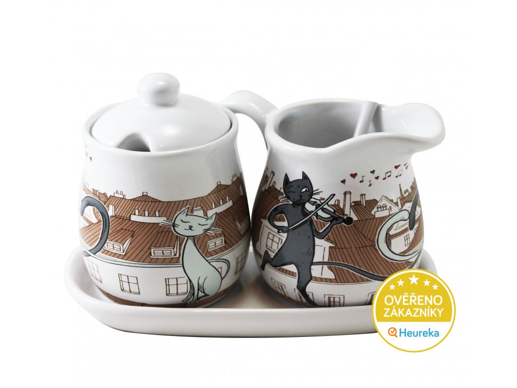 Stylová keramická sada, ve které je cukřenka a konvička na mléko a podtácek s krásným kočičím motivem. Pro klidné chvilky u kávy.