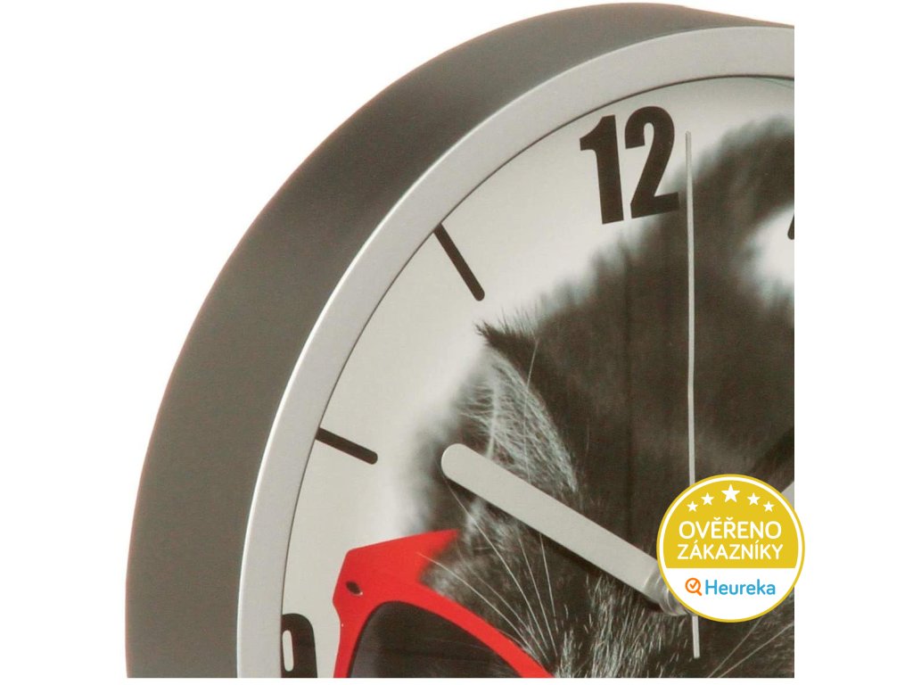 Originální nástěnné hodiny s černo-bílou kočičkou s velkými červenými brýlemi. Parádní doplněk do originální kočičí domácnosti.