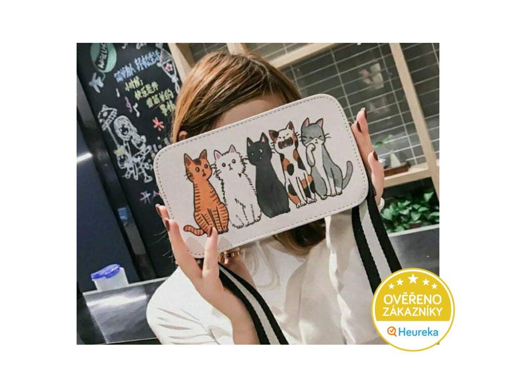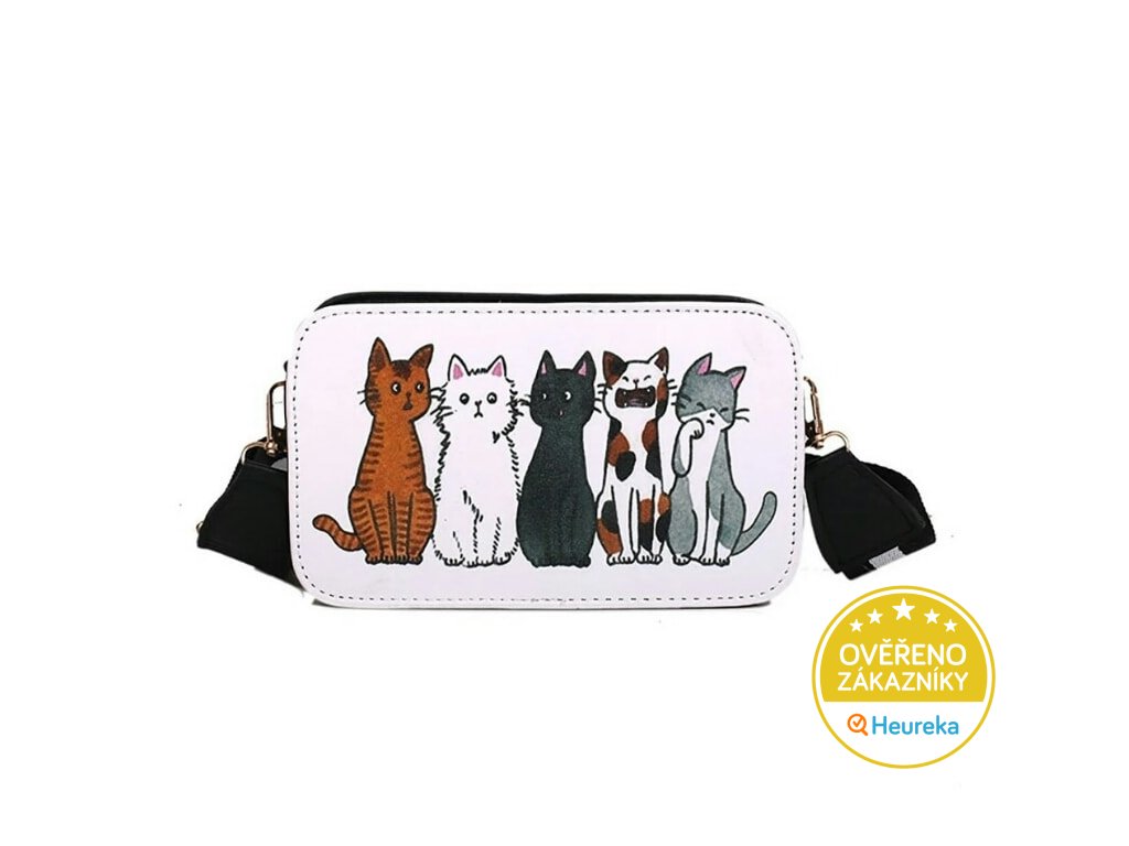 Menší trendy kabelka z koženky a látky, s pěti veselými kreslenými kočičkami. Parádní na peněženku, klíče i mobil. Kabelka se zapíná na zip. Na dlouhém nastavitelném popruhu.