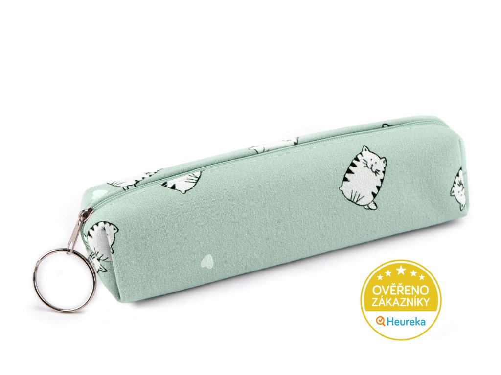 Látkový penál s kreslenou kočkou - modrá, zelená