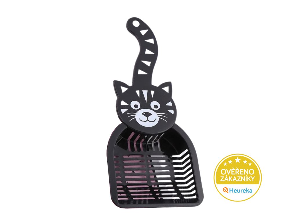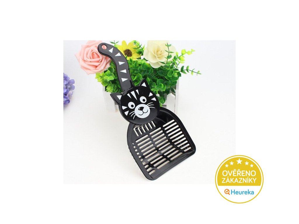 Tradiční pomůcka každé kočičí domácnosti - praktická lopatka na hrudky s kočičím motivem. V růžové, zelené, nebo bleděmodré barvě.