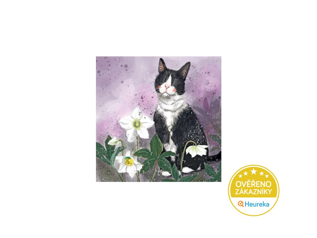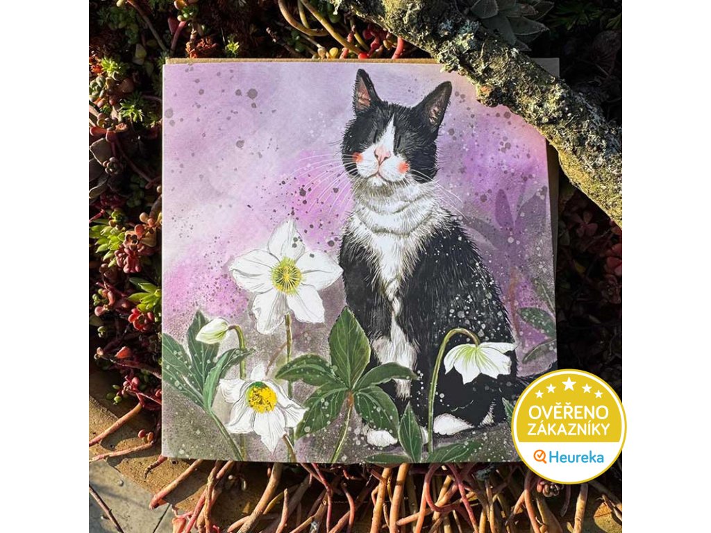 Designové menší blahopřání či děkovací kartička s kočičkou a bílými květy, v obálce. Autorský obrázek je od Alex Clark.