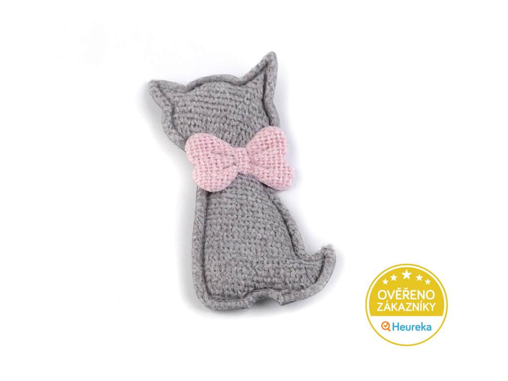 Originální textilní aplikace - nášivka ve tvaru šedé kočičky s růžovou mašličkou. Perfektní na ozdobení kabelky, batůžku, mikiny, bundy, svetru či čepice. Určitě ji využijete také při scrapbookingu při vytváření přáníček, deníčků aj.