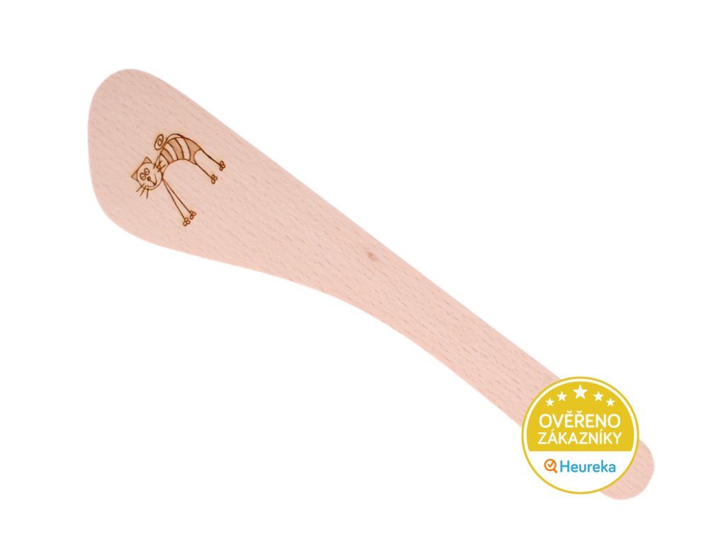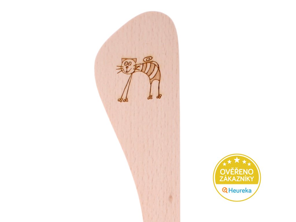 Parádní dřevěná kuchyňská obracečka z bukového dřeva s gravírovanou kočkou. Skvělý pomocník na vaření i ozdoba každé kočičí kuchyně. Z autorské dílny ze severu Moravy.