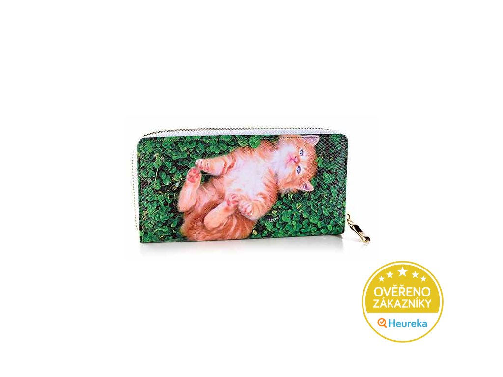 Velká peněženka s krásným zrzavým koťátkem na trávníku ze čtyřlístků. Tahle kočička bezpečně pohlídá vaše peníze, kreditky i doklady - do 14 přihrádek se vejde vše, co potřebujete.