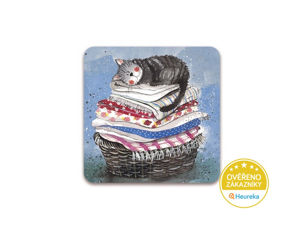 Designový korkový podtácek s kočičkou v košíku s prádlem, perfektní podložka pod kávu i čaj, v designu malířky Alex Clark. Krásný dárek pro radost každému milovníkovi kočiček.