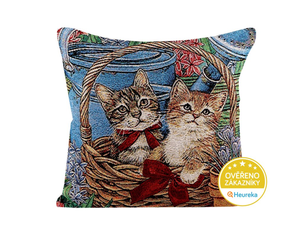 Precizně zpracovaný gobelínový vyšívaný povlak na polštář - tapiserie se dvěma kočičkami v košíku. Krásný doplněk stylové domácnosti. Kočičky jsou z jedné strany polštáře.