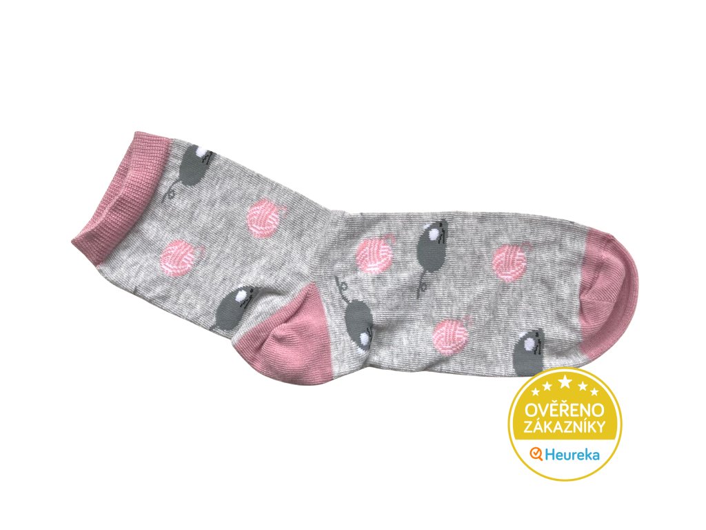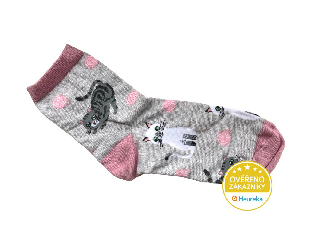 Hravé růžovo-šedé asymetrické ponožky - na jedné jsou koťata a na druhé myšky. Schválně, chytí kočka myš? Velikost 37-41.