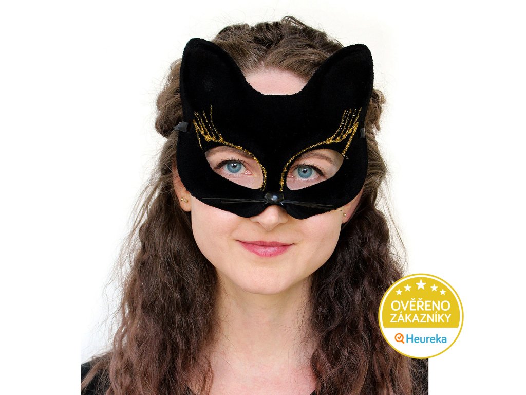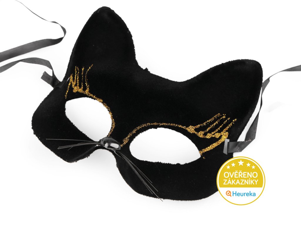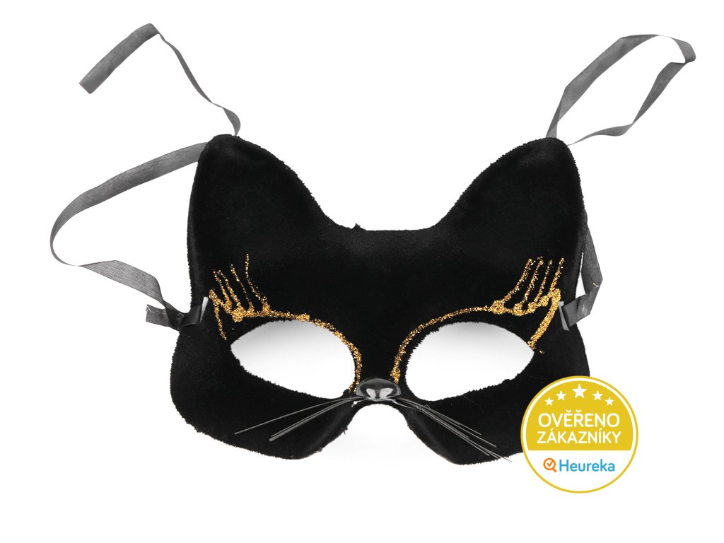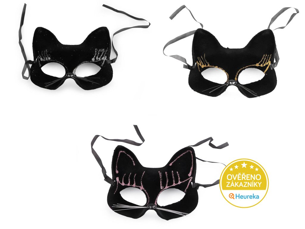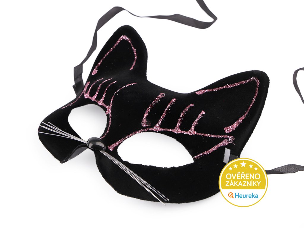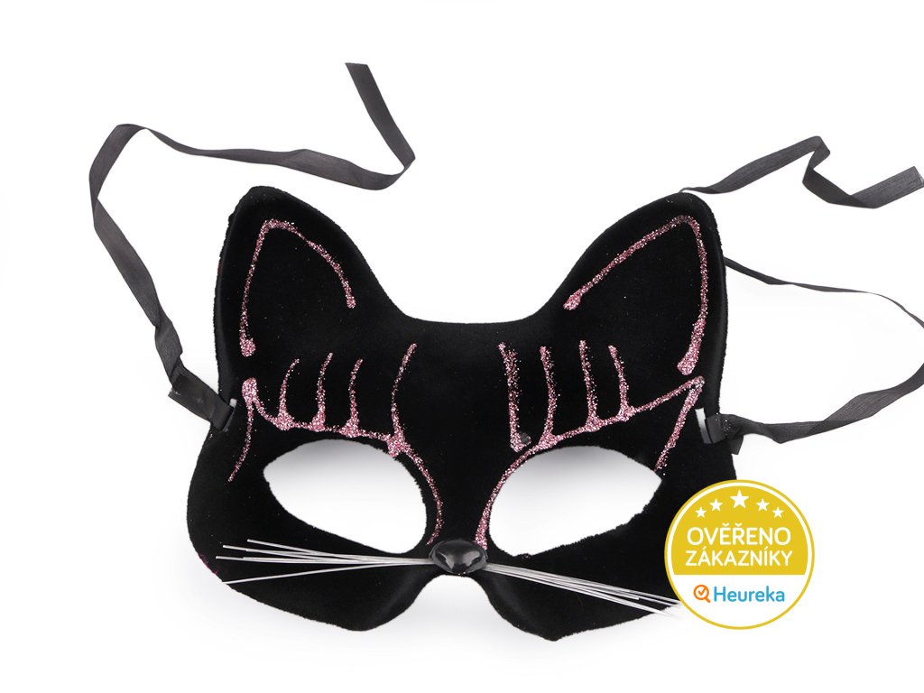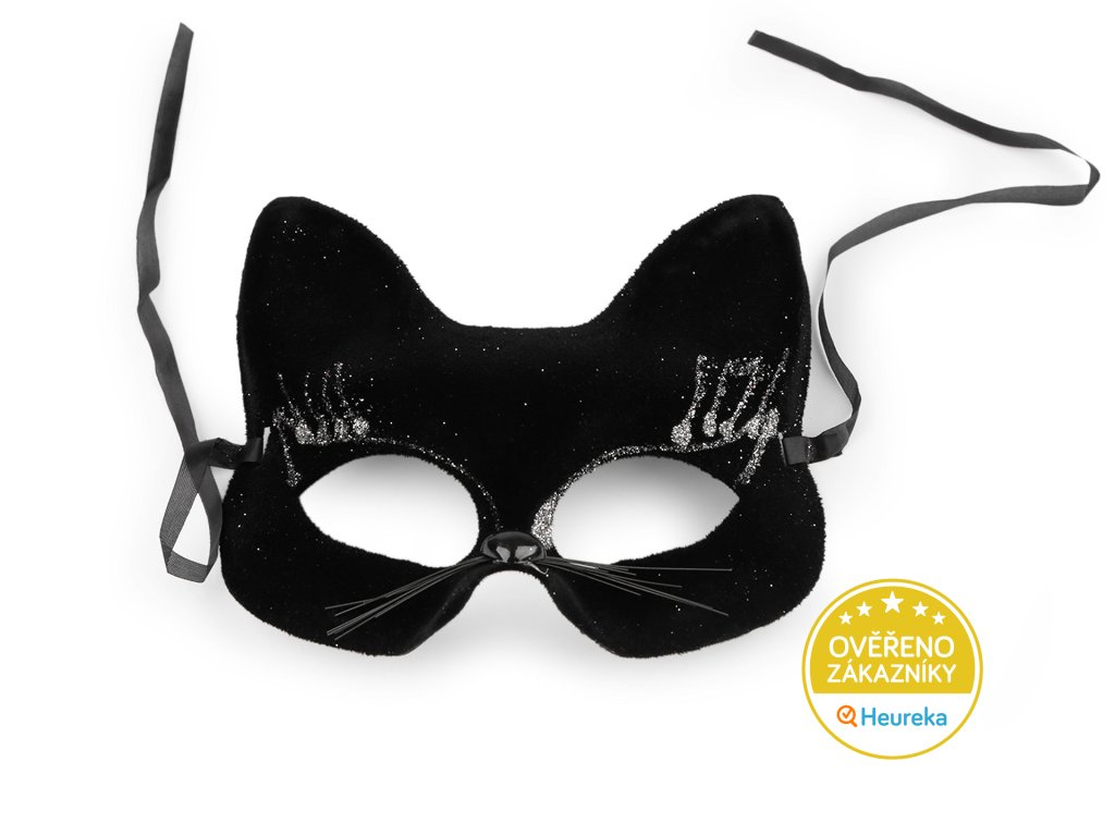 Černá sametová kočičí maska na zavazování na stužky, se třpytivými detaily a čumáčkem s vousky, v jedné ze tří barevných variant. Mňau!