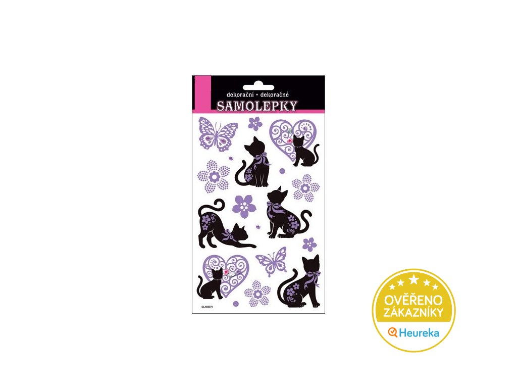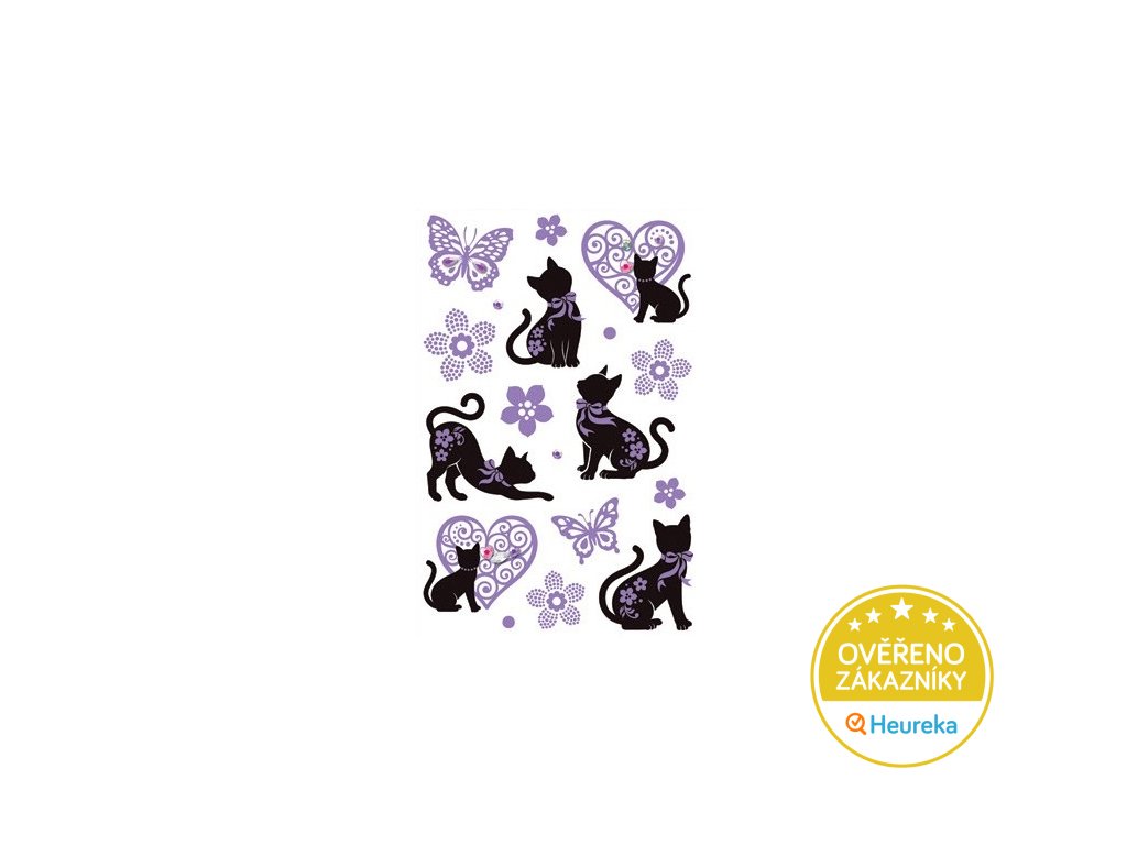 Arch samolepek s černými kočičkami, fialovými detaily a třpytivými kamínky. Perfektní na zeď, do diáře i na auto. Parádní drobnost pro všechny milovníky koček