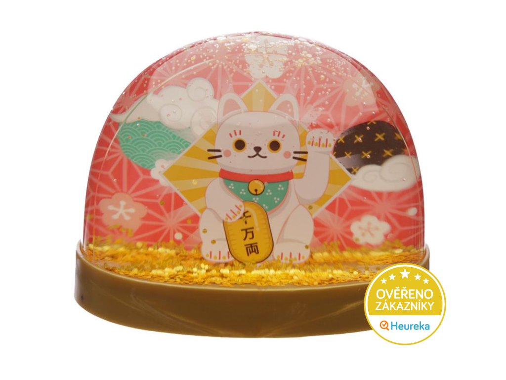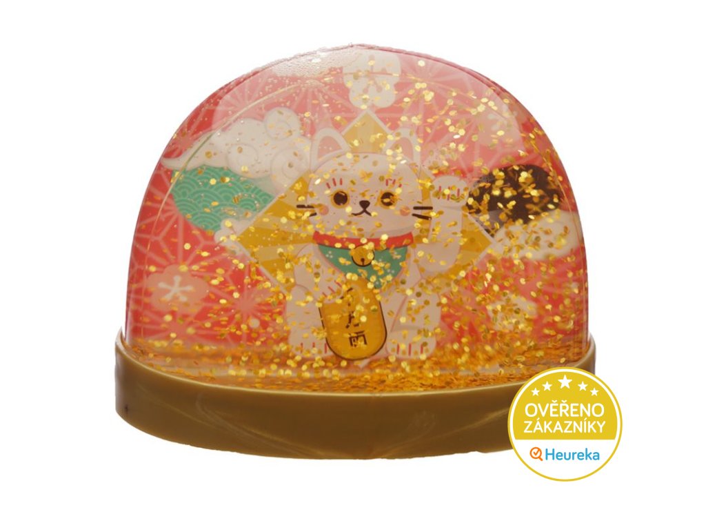 Sněžítko - průhledná polokoule, uvnitř které sněží zlaté třpytky na japonskou kočičku pro štěstí Maneki Neko. V dárkové krabičce.