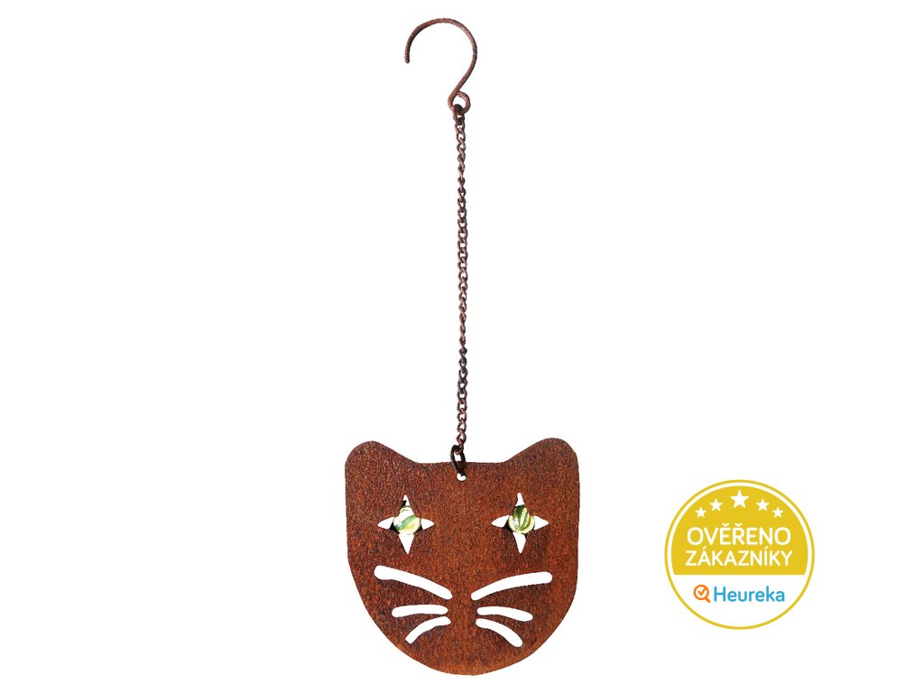 Stylová venkovní dekorace na plašení ptáků a nezvaných hostů v podobě kočičí hlavy na řetízku a se skleněnýma očima, které se na slunci pěkně blýskají. Strašák je záměrně pokrytí rzí pro vyvolání "prastarého" dojmu.