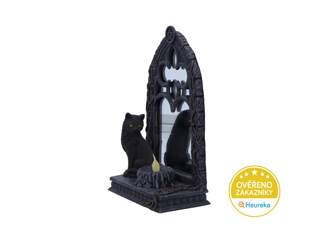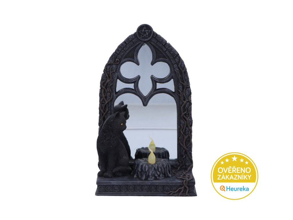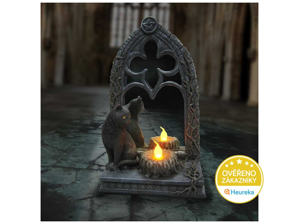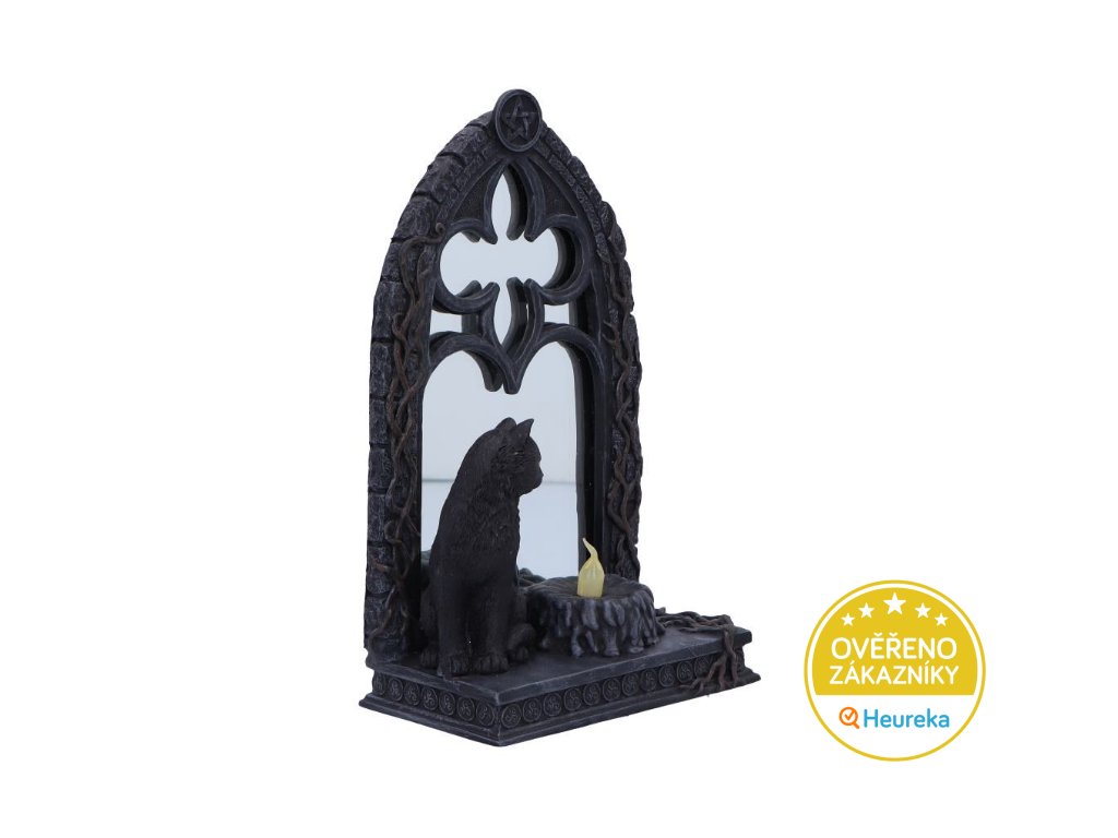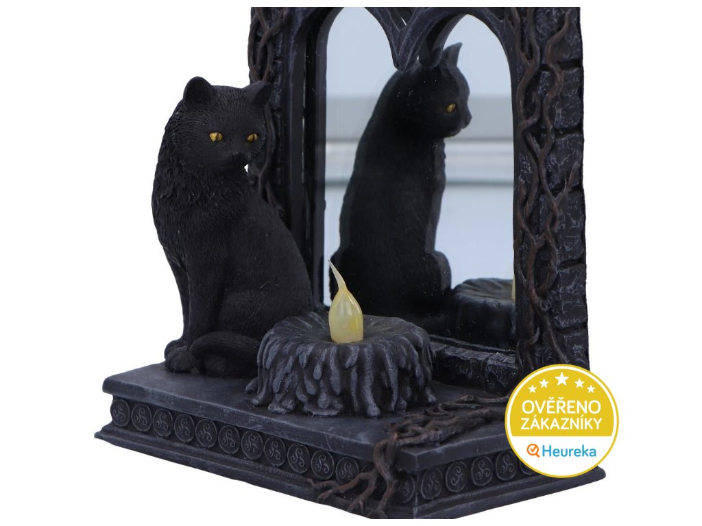 Mimořádně efektní, 21 cm vysoký, ručně malovaný masivní svícen (na elektrickou svíčku) s kočkou a zrcadlem ve tvaru gotického okna. Dokonalý do čarodějné kočičí domácnosti.