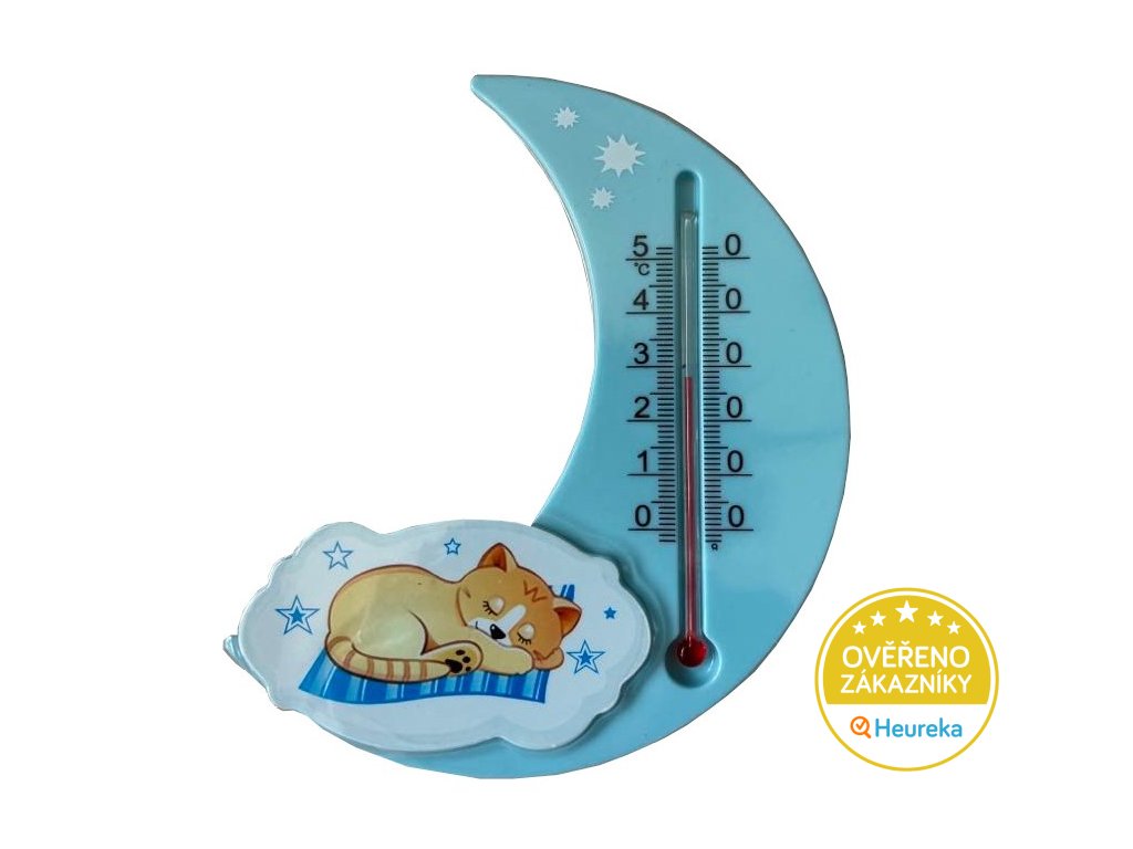 Roztomilý teploměr ve tvaru měsíce se spícím kotětem, v bleděmodré nebo růžové barvě. Perfektní na zeď či poličku v dětském pokoji.